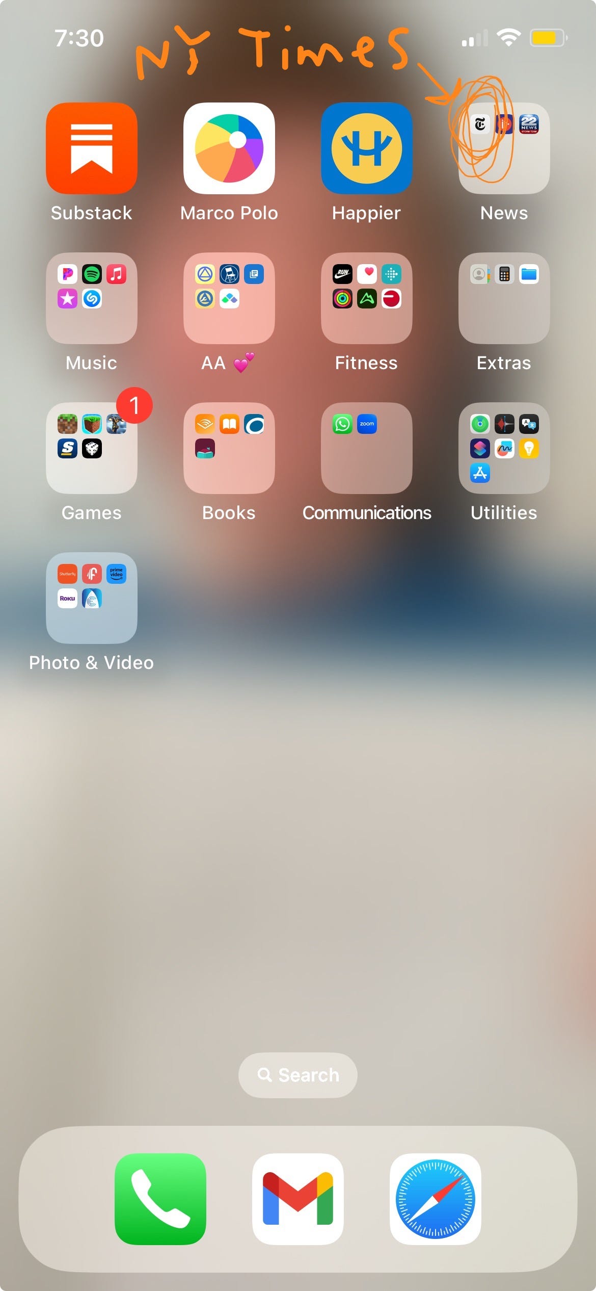 If I want to find The New York Times app, which is kryptonite for this information junkie, I have to scroll to the second page, find the new folder titled ‘News,’ and click on it from there.